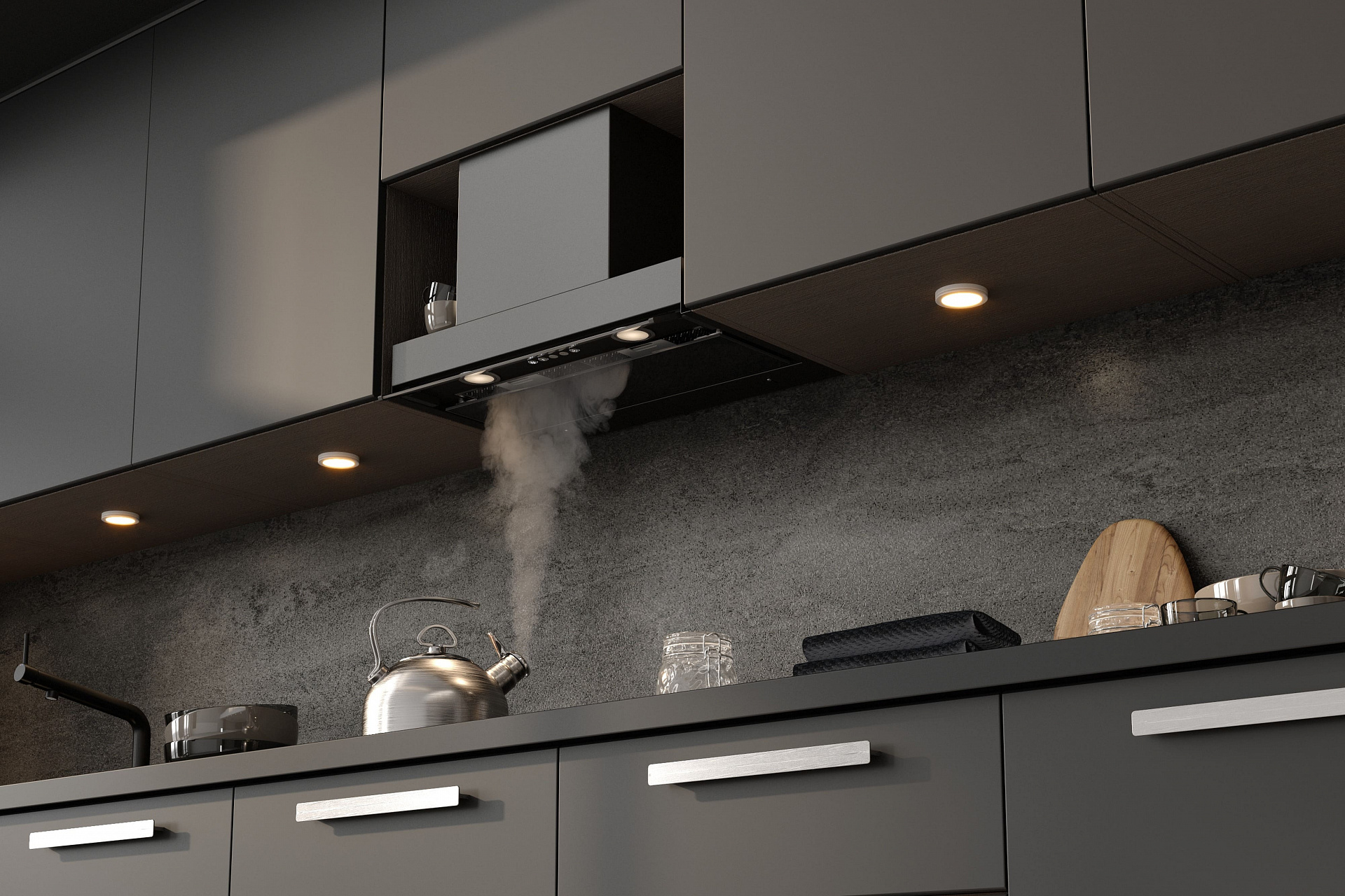 Благодаря плоской нижней панели корпуса, встроенная в шкаф вытяжка абсолютно незаметна после установки. Это позволяет интегрировать вытяжки Elikor в интерьер любого стиля и формата.