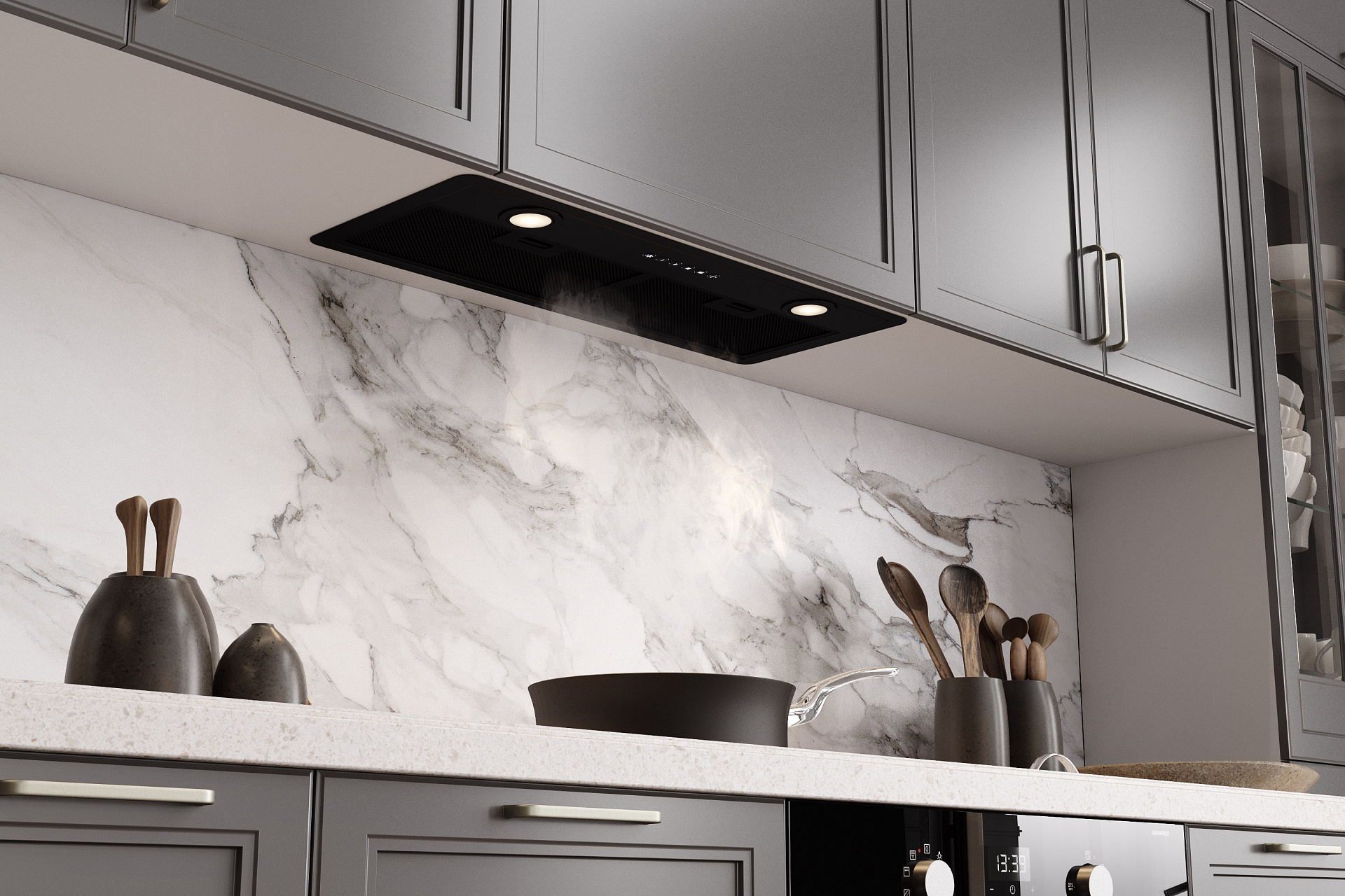 Благодаря плоской нижней панели корпуса, встроенная в шкаф вытяжка абсолютно незаметна после установки. Это позволяет интегрировать вытяжки Elikor в интерьер любого стиля и формата.