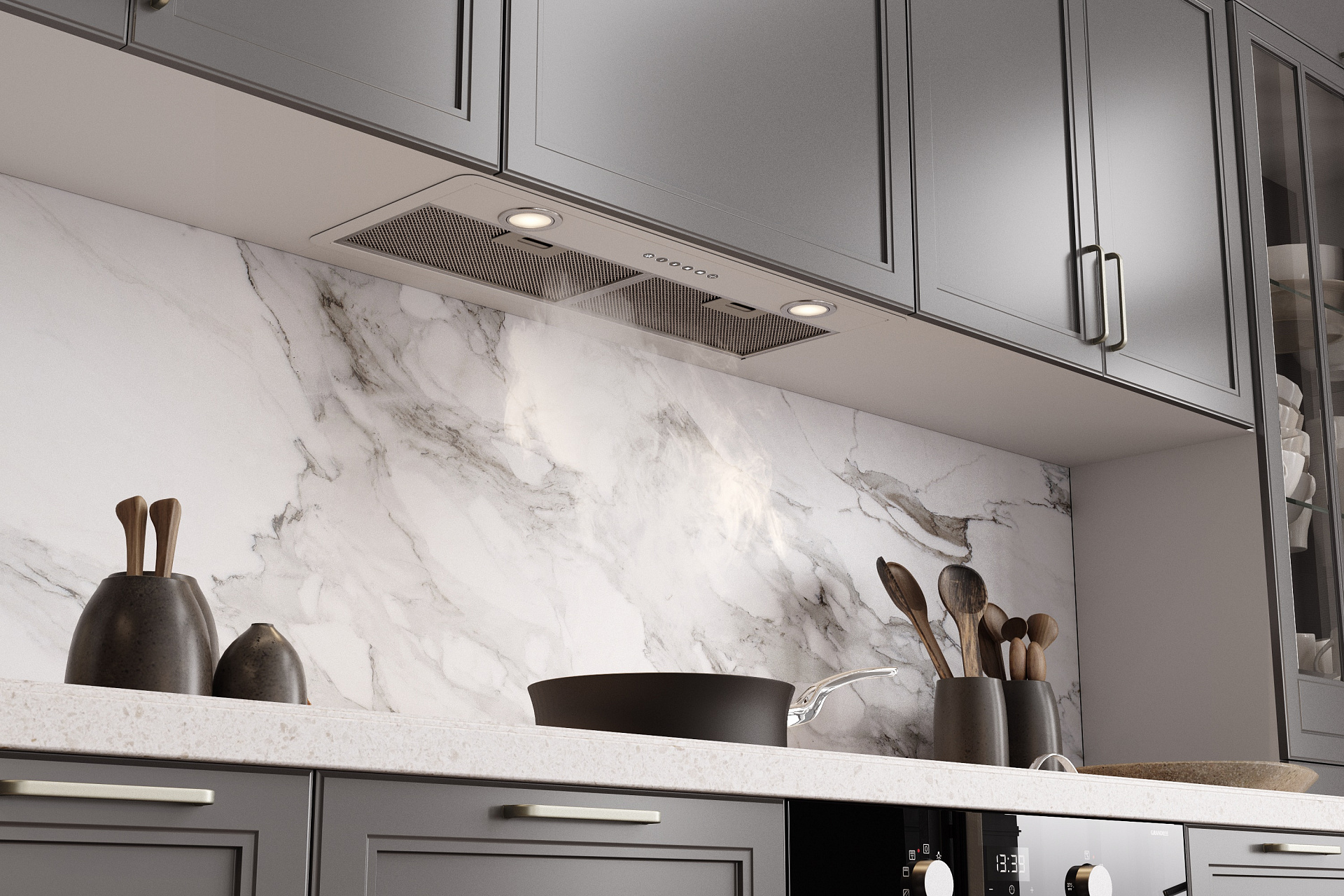 Благодаря плоской нижней панели корпуса, встроенная в шкаф вытяжка абсолютно незаметна после установки. Это позволяет интегрировать вытяжки Elikor в интерьер любого стиля и формата.